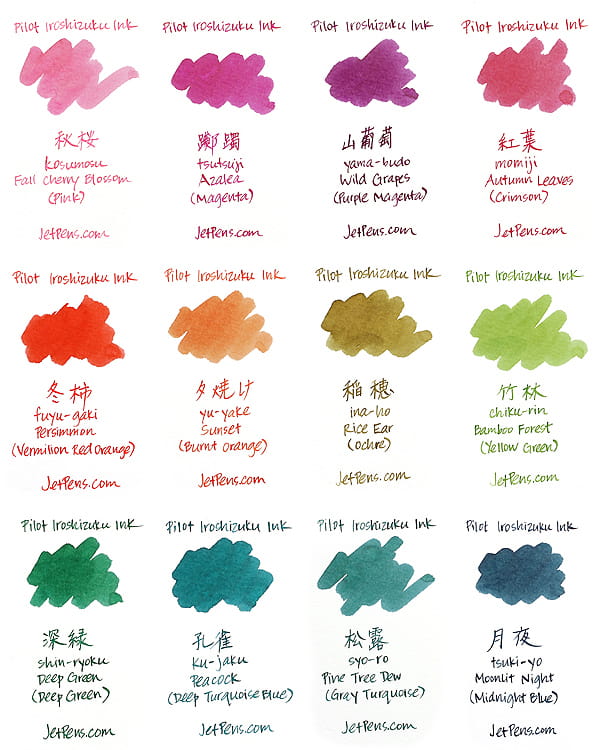 Nazwa "Iroshizuku" jest połączeniem japońskich słów "Iro" (kolorystyka) i wyraża wysokie standardy i zmiany kolorów oraz "Shizuku" (kropelka), będąca ucieleśnieniem obrazu samej kapiącej wody. Każda nazwa pochodzi od nazw pięknych japońskich krajobrazów i roślin.