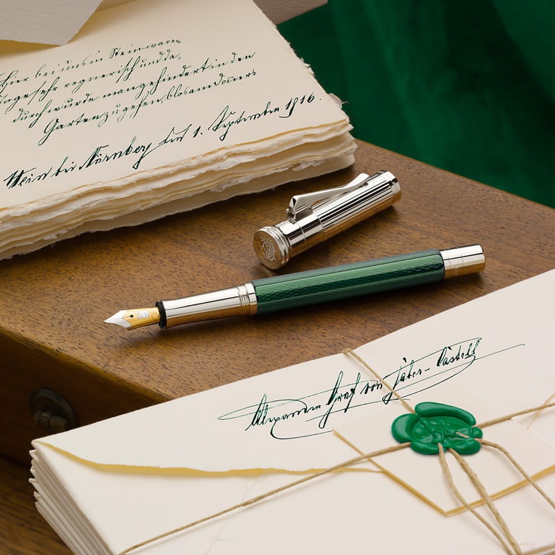 Misternie wykonane pióro wieczne emanuje klasyczną elegancją z odrobiną nostalgii. Zaskakuje artystyczną syntezą będącą połączeniem tylko najlepszych materiałów. Wszystkie metalowe części wykonano ze sterlingowego srebra próby 925, natomiast stalówkę z 18 karatowego, dwukolorowego złota. Na zwieńczeniu skuwki znajdziemy dwa radełkowane pierścienie charakterystyczne dla wyrobów piśmienniczych marki Graf von Faber-Castell z litego srebra.