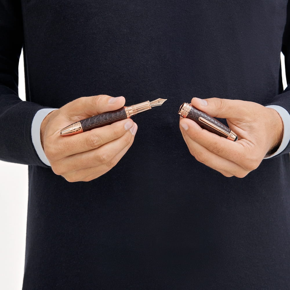 Pióro wieczne Montblanc Great Masters Exotic Leather Brown Alligator jest duże i masywne, idealnie sprawdzi się w męskiej dłoni. Przypomina swoją strukturą skórę gada.