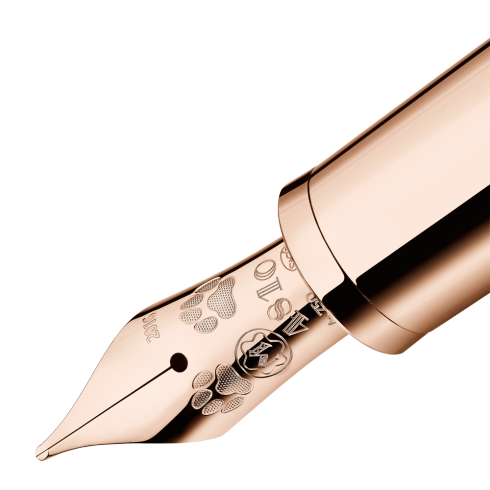 Skuwka wykonana z białego marmuru to czysty design. Klips to podbizna lwów, wykonany z różowego złota. Oczy zwierząt to rubiny, które nadają jeszcze większej elegancji. Stalówka została stworzona z 18k złota. Możemy dostrzec na niej ślady psich łap to nawiązanie do 14 psów rasy Lhasa Apso, których właścicielką była Peggy Guggenheim.