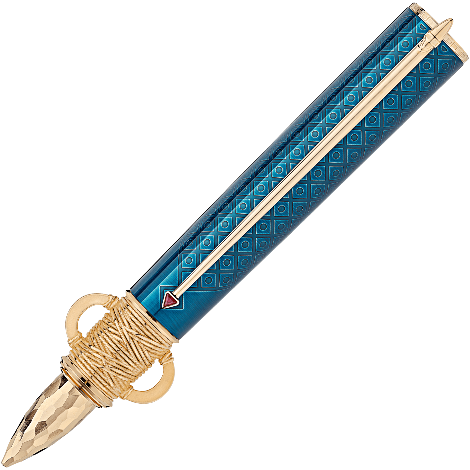 Kolekcja Montblanc Art Homage Moctezuma I ze złotymi wykończeniami w kolorze szampana jest dedykowana temu największemu władcy jednej z najbardziej wyjątkowych kultur w historii świata. Ogólny projekt inspirowany jest narzędziem o nazwie - atlatl, do rzucania włócznią. Kształt stożka, udoskonalony młotkowym wykończeniem, oparty jest na azteckim nożu ofiarnym z obsydianowym ostrzem. Kolory lakieru - benzyna i karminowa czerwień - inspirowane są kolorami królewskiego płaszcza. Dwa hieroglify zdobiące skuwkę symbolizują lata panowania Moctezuma I. Ręcznie wykonana stalówka Au 750 jest ozdobiona drobnym grawerem inspirowanym azteckim glifem dla miasta Tenochtitlán: trójramienny kaktus z królewskim diademem i dwoma zwojami.