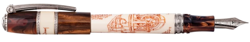 Pióro wieczne wykonane z żywicy, malowanej specjalną techniką Scrimshaw. Stalówka 23 kt złota pokryta palladem. Wykończenia 18 kt złoto. System napełniania atramentu Power Filer. Pióro wieczne zakręcane.