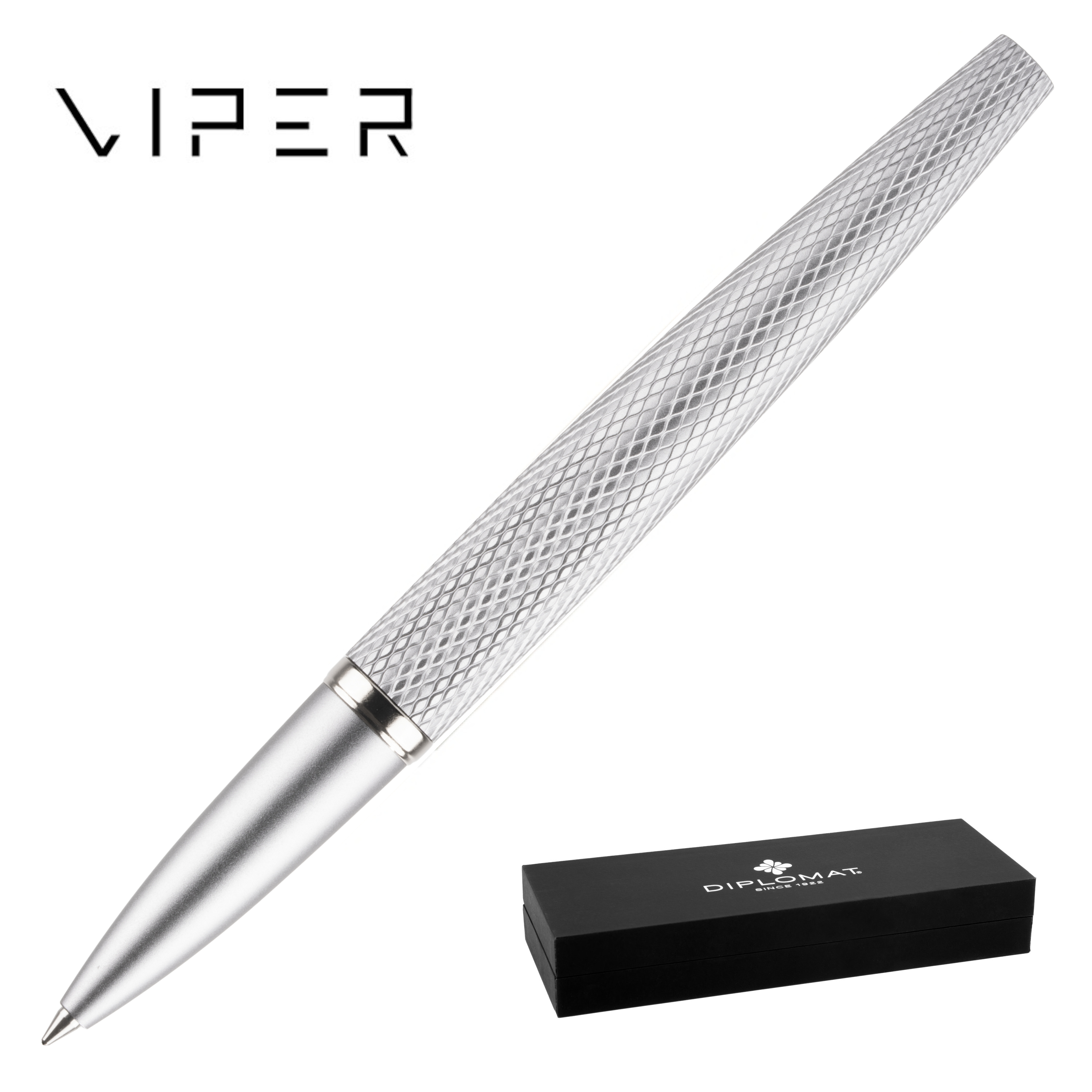 Diplomat VIPER Guilloche Silver pióro kulkowe umieszczone jest w eleganckim, firmowym pudełku.
