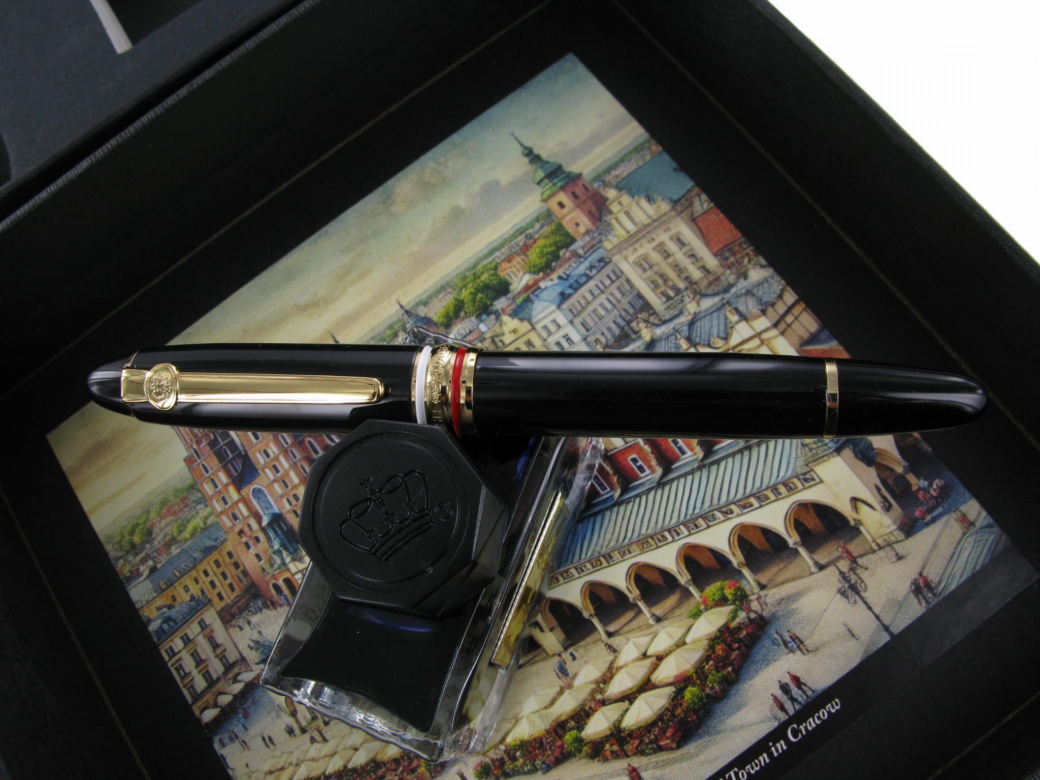 Pióro posiada  kartonowe  opakowanie z  atramentem tle  Krakowa