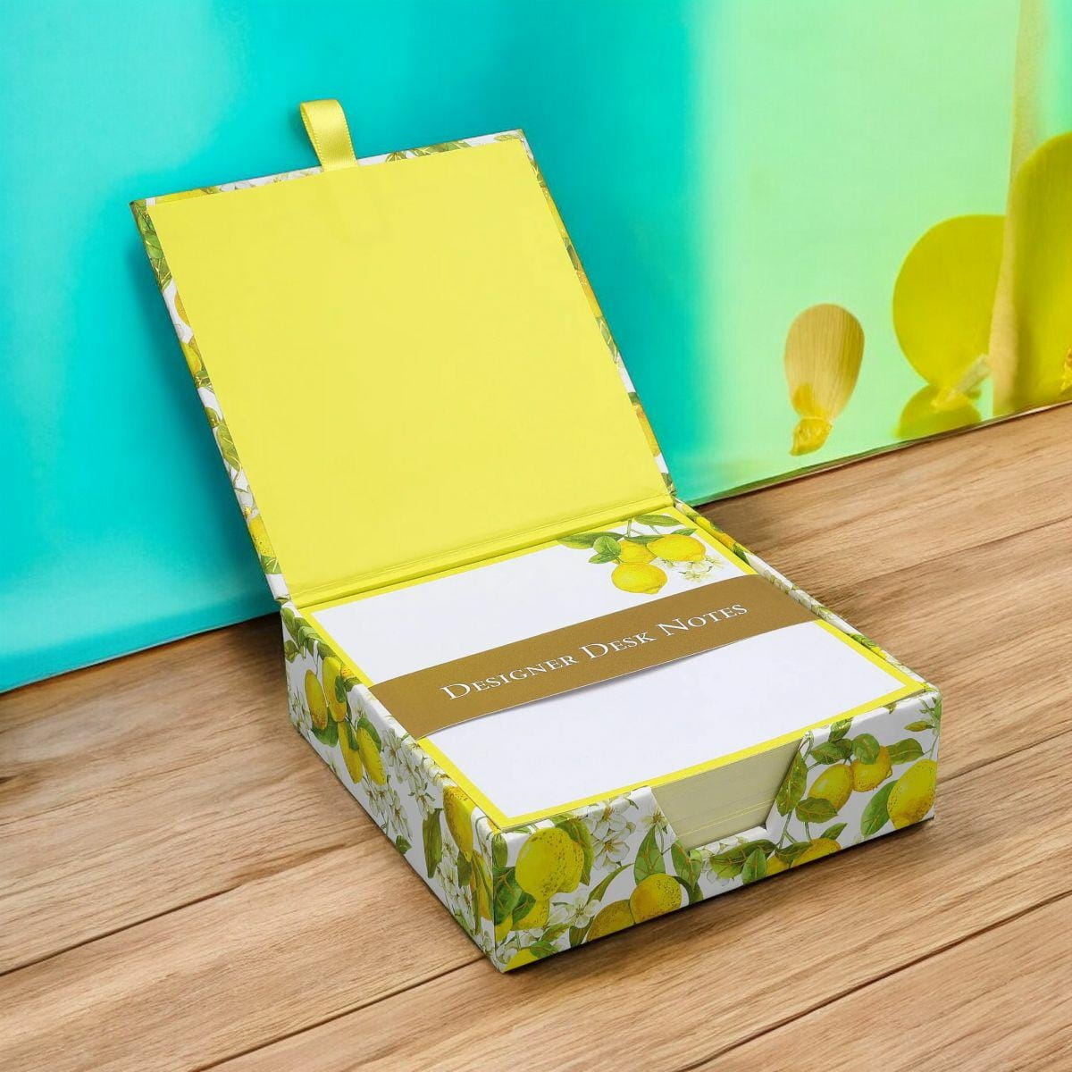 Zestaw 250 ozdobnych karteczek z motywem słonecznych cytryn z Amalfi, zamknięty w eleganckim pudełku na magnes. Wykonane z wysokiej jakości papieru, idealne do codziennych notatek. Stylowy dodatek na biurko – praktyczny, a zarazem dekoracyjny zamiennik klasycznej kostki biurowej.