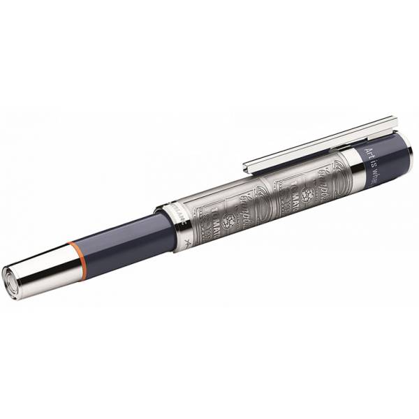 Pióro wykonano z niebieskiej żywicy na którą nałożono platynowaną tuleję, przypominającą puszki z zupą Campbell .