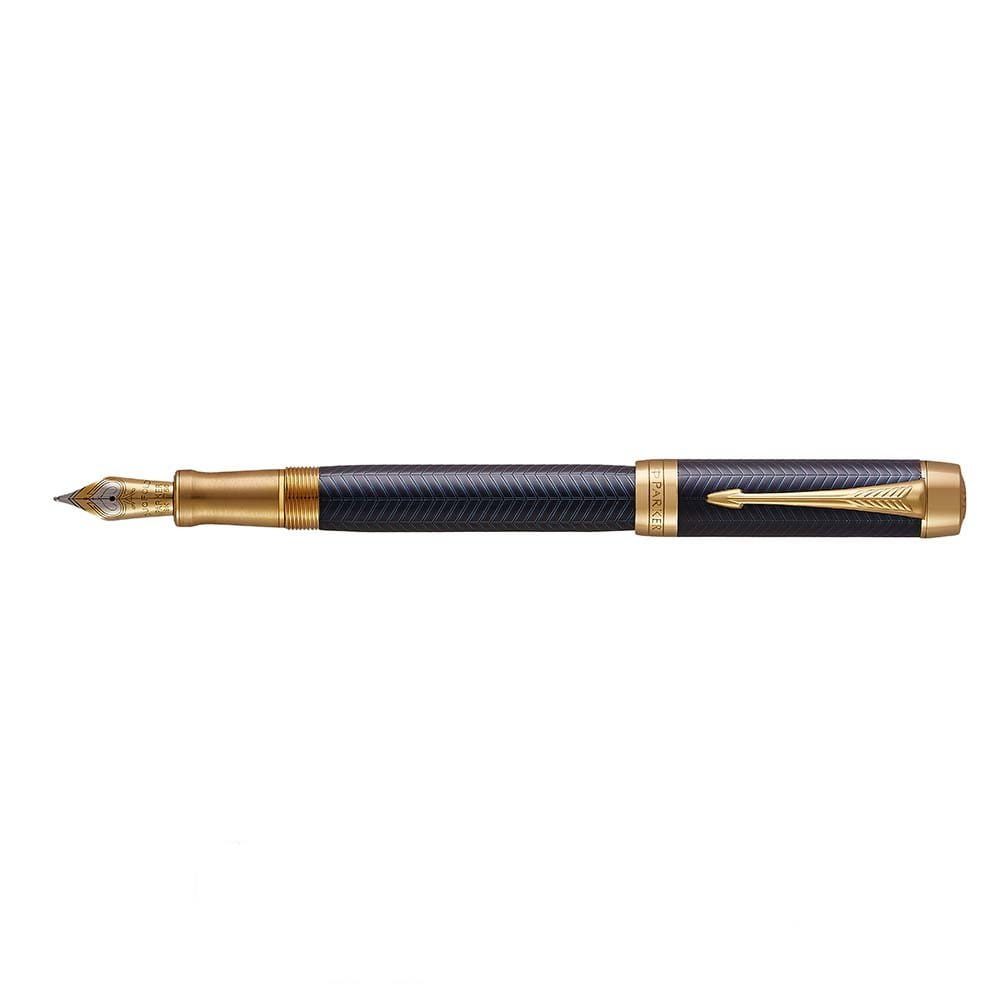 Prestige to zupełnie nowa kolekcja piór wiecznych Duofold stworzona na cześć tradycji i kunsztu produktów tej historycznej linii. Korpus i nasadka pokrywa geometryczny wzór naniesiony z wielką precyzją laserem na metaliczny, niebieski lakier. Efekt delikatnego wzoru jodełki został osiągnięty dzięki trawieniu powłok, szlifowaniu, nałożeniu błękitnego lakieru; laserowo wykonany wzór jest pokryty półprzezroczystym werniksem. Baza pióra wykonana z mosiądzu. Charakterystycznymi elementami są potrójny pierścień wieńczący skuwkę pióra z oznaczeniem marki Parker oraz oznaczenie kraju wykonania - Made in France na łączniku sekcji.