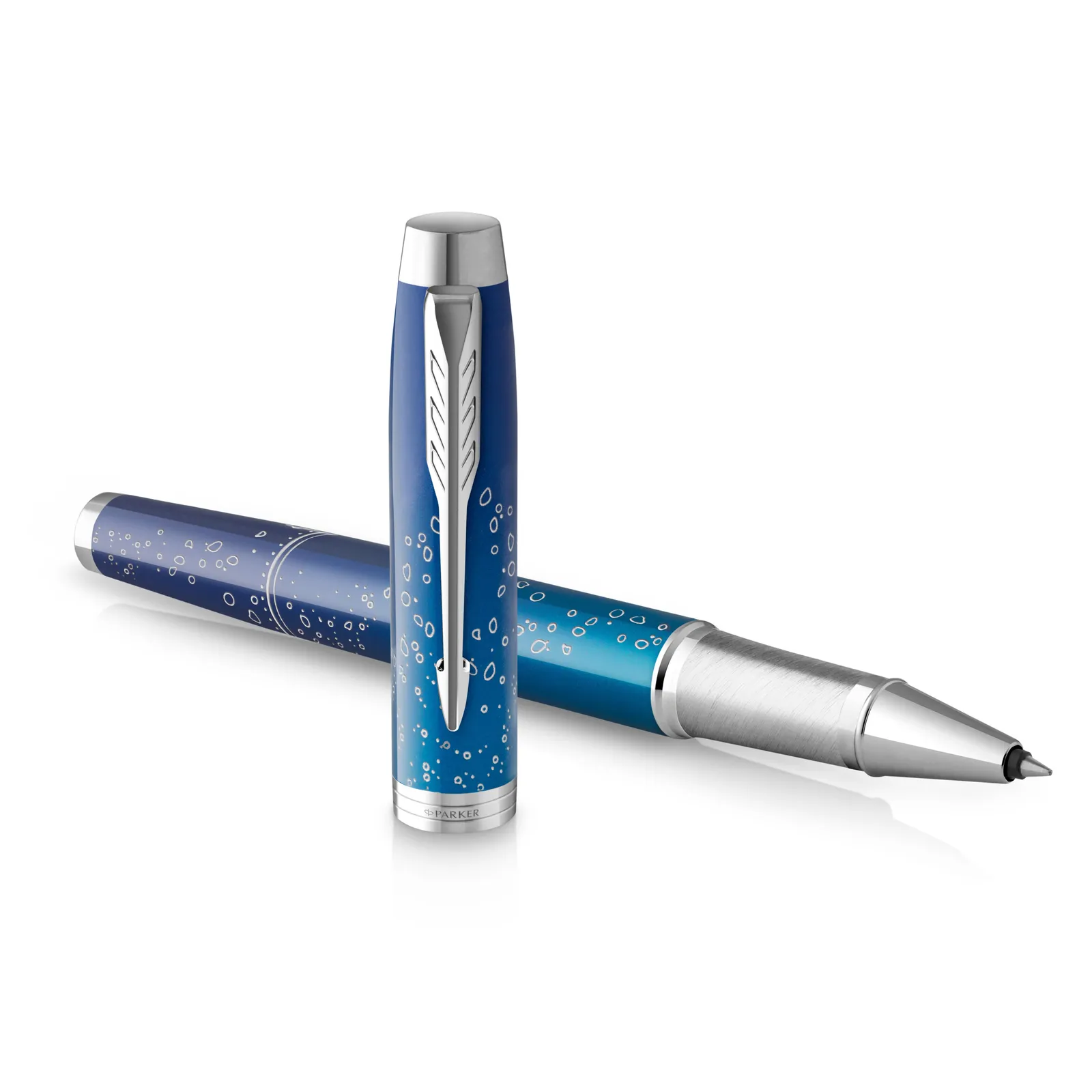 Nasadka pokryta cieniowanym lakierem w kolorze niebieskim i korpus ozdobiony wyczuwalnym grawerowanym wzorem inspirowanym eksploracją morskich głębin. Całość uzupełniają chromowane wykończenia i charakterystyczny klips w kształcie strzałki PARKER.