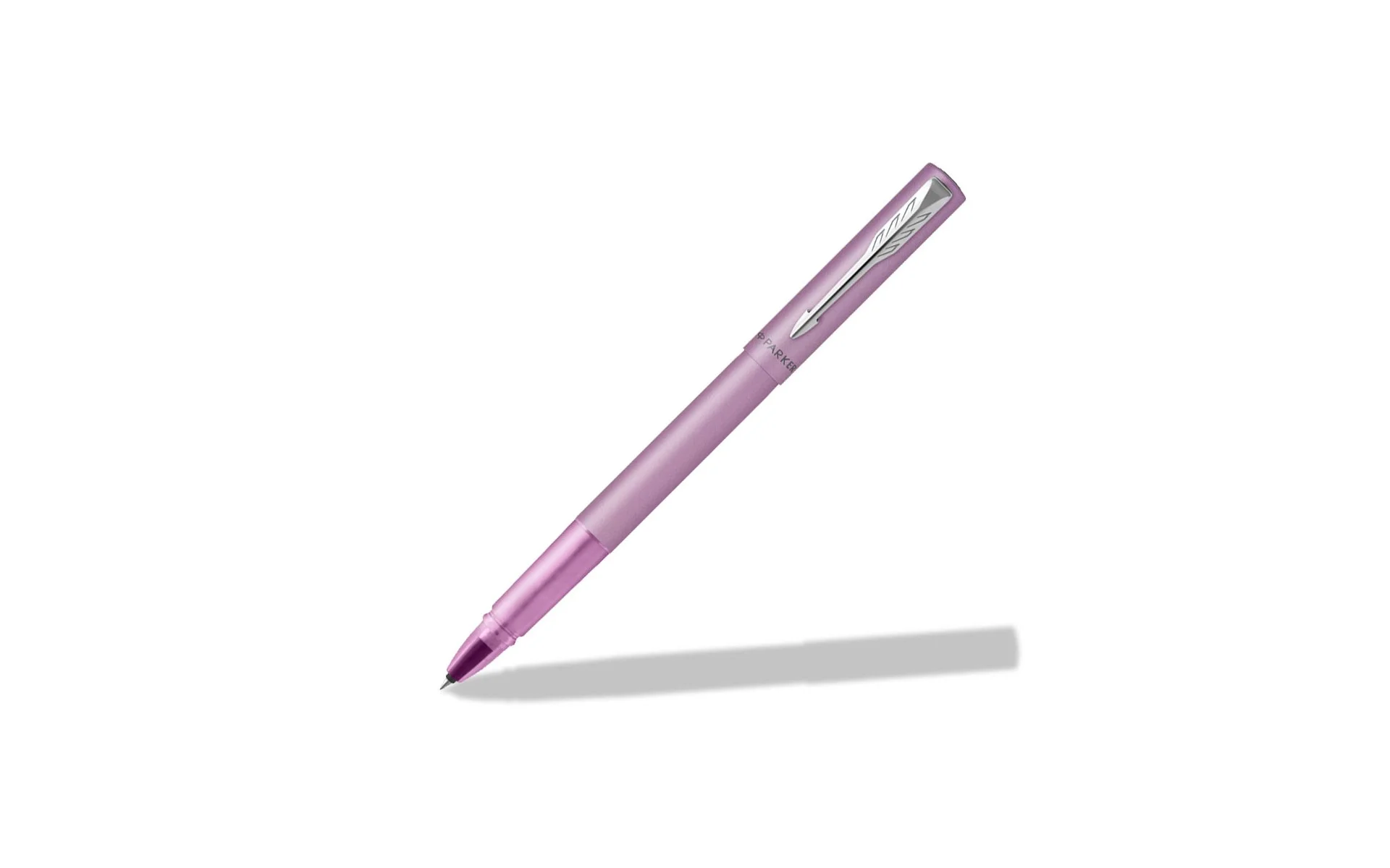 Metaliczne wykończenie w satynowym czarnym kolorze uzupełnione chromowanymi wykończeniami i charakterystycznym klipsem w kształcie strzałki PARKER. Częściowo przezroczysta część przednia.