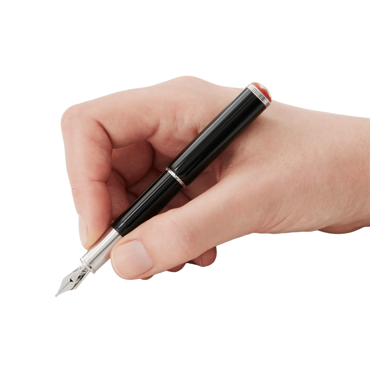 Czarny, drogocenny lakier z detalami pokrytymi platyną jest zwieńczony emblematem Montblanc z cennej żywicy, otoczonym kultowym koralowym kolorem kolekcji Montblanc Rouge et Noir. Ręcznie wykonana stalówka ze złota 585 z rysunkiem Mont Blanc.