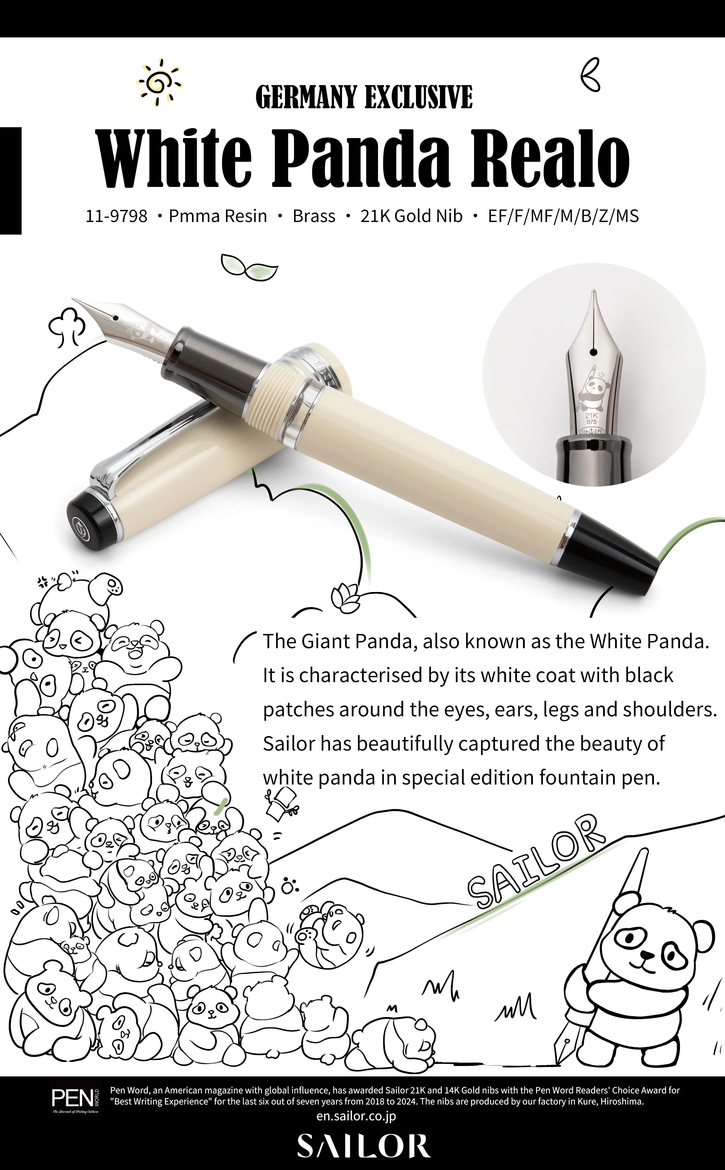Sailor prezentuje kolejną wyjątkową edycję – White Panda, stworzoną wyłącznie na rynek niemiecki. Inspirowana największą z pand, o śnieżnobiałym futrze i charakterystycznych czarnych obwódkach wokół oczu, edycja ta łączy w sobie kunszt japońskiego rzemiosła z designem oddającym naturę i elegancję.