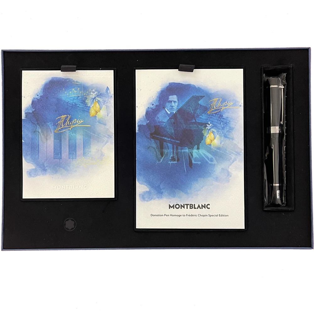 Pierścień na skuwce zawiera nuty z jego słynnego nokturnu „B-moll op.9 nr 1” wraz z logo Montblanc. Sygnatura Chopina znajduje się również z tyłu skuwki. Niebieskie okienko, które pojawia się na obudowie, nawiązuje do jego „La Note Bleue”.