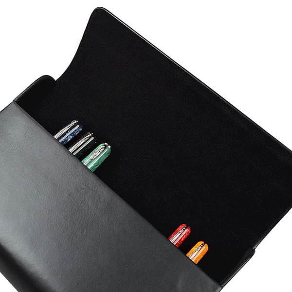 Przedstawiamy eleganckie skórzane etui na pióra Pineider z aksamitnym wnętrzem, dzięki czemu art. piśmienne nigdy nie są narażone na zarysowania lub wgniecenia. Magnetyczny system zamykania utrzymuje pióra bezpiecznie na miejscu i umożliwia wygodny dostęp w każdej chwili. Wyprodukowane we Włoszech zachowuje swój klasyczny kształt, aby zapewnić najwyższą jakość ochrony Twoich ulubionych piór.