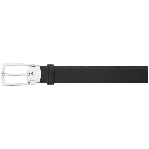 Pasek Montblanc Belts posiada prostokątną czarną klamrę ze skóry i stali nierdzewnej. Samoregulujący, czarny skórzany pasek o wymiarach 3 cm x 120 cm z nadrukiem Saffiano.