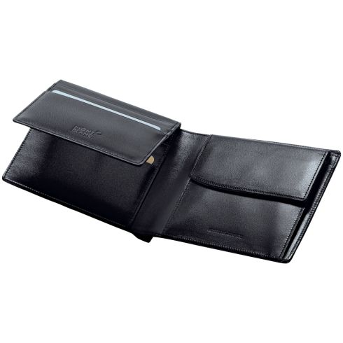 Portfel Montblanc Meisterstück 8cc wykonany z czarnej skóry bydlęcej z unikalnym głębokim połyskiem. Posiada żakardową podszewkę, emblemat Montblanc z pierścieniem pokrytym palladem i 8 kieszeni na karty kredytowe, 2 przegrody na banknoty oraz 2 dodatkowe kieszenie.
